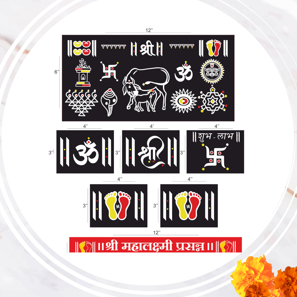 Sacred Designs: Features Om, Shree, Swastik, Shubh Labh, Cow with calf, Surya, Shankha, Lotus, Kalash, Paduka, and Mahalaxmi blessings.
