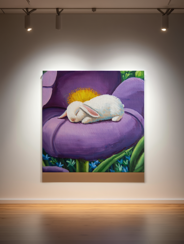Add softness, sweetness and charm to any space with this adorable sleeping bunny artwork.
