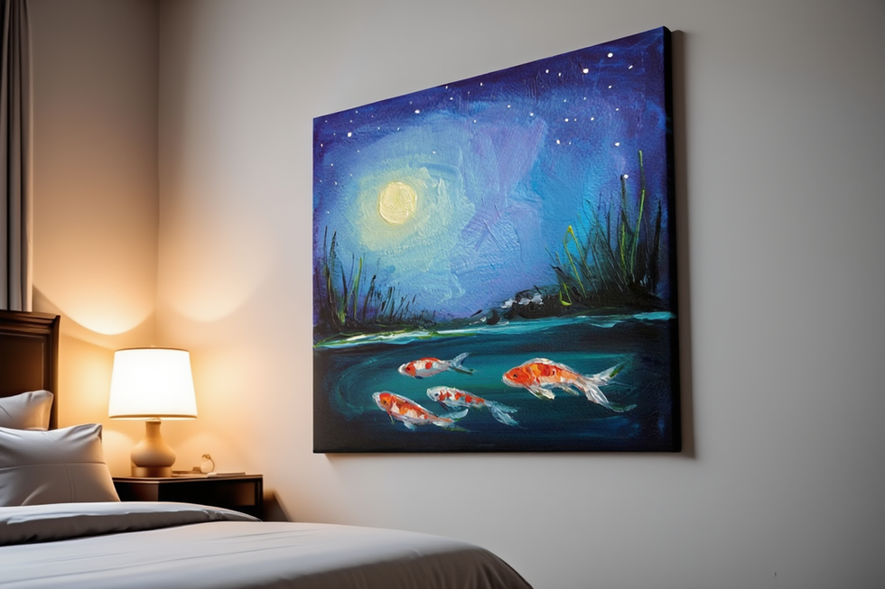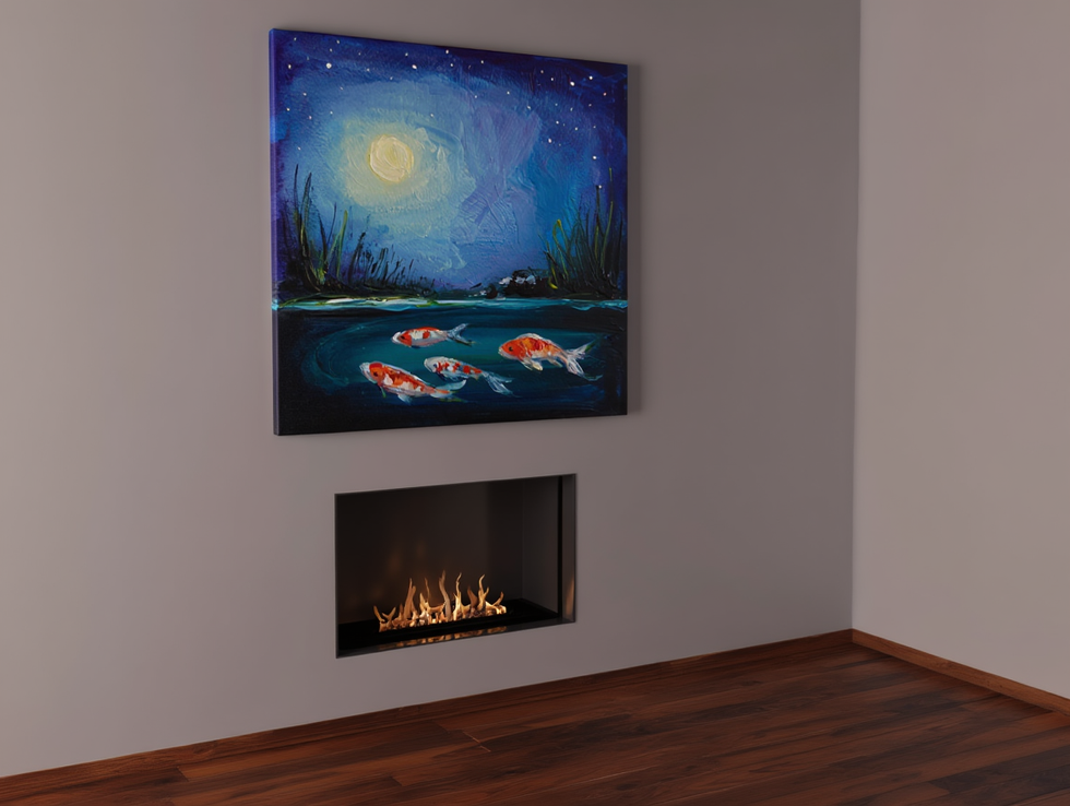 The gentle movement of koi against the night sky creates a visually calming and artistic focal point.