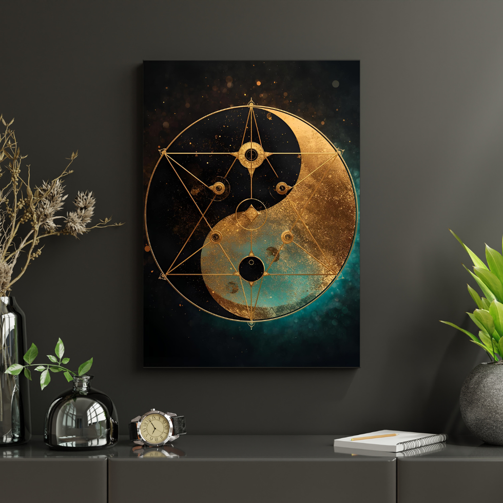 A golden cosmic Yin-Yang infused with sacred geometry, symbolizing balance, unity, and the eternal harmony of light and shadow.