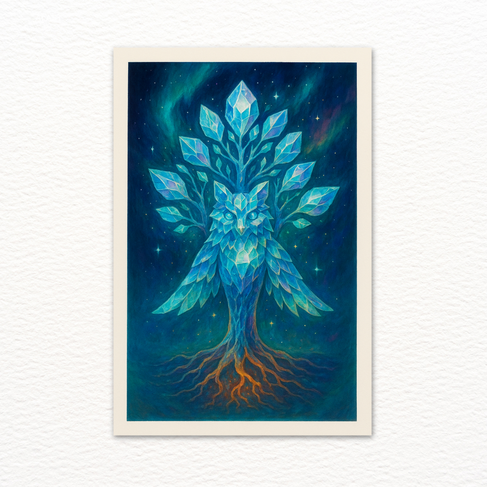 An owl-shaped tree of radiant crystals, rooted in earth yet glowing with the wisdom of the stars.🌌🦉💎