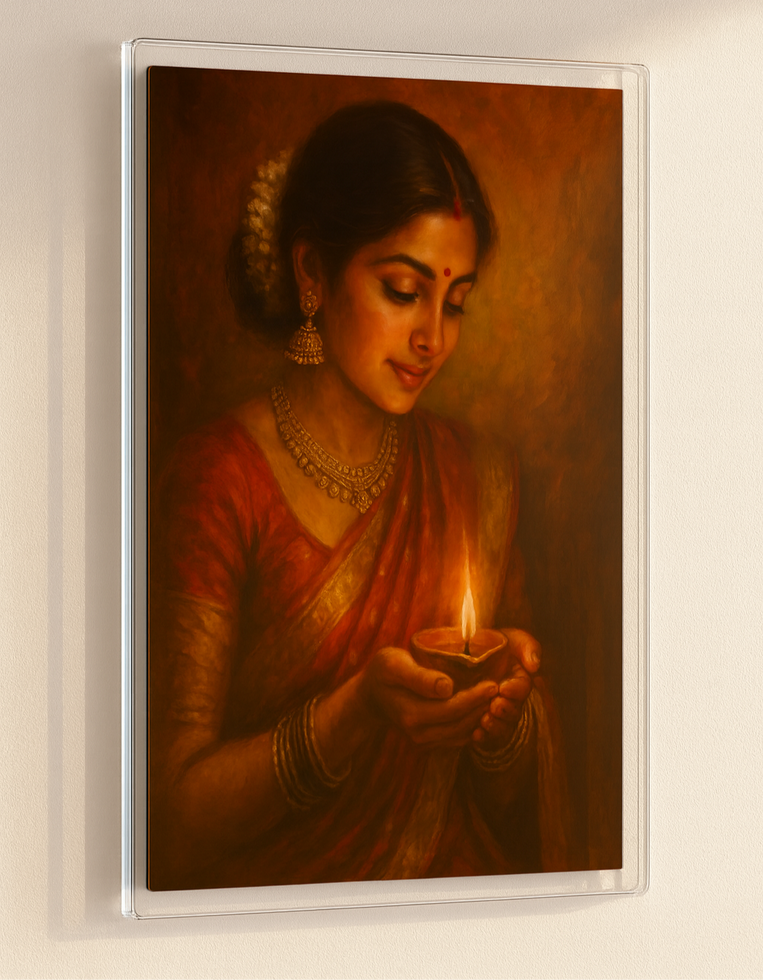 Elegant Painting – A serene woman in a traditional saree, holding a diya with devotion.