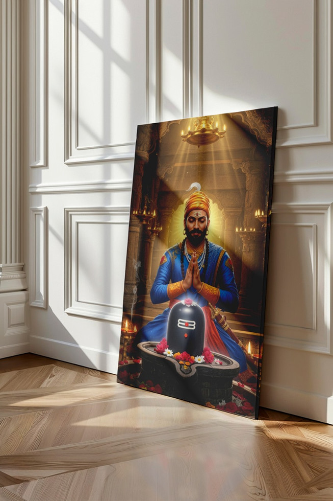 Illuminate your space with the piety of the Maharaj, showcasing Chhatrapati Shivaji in deep devotion, with radiant light streaming down upon the Shivlinga. A spiritually uplifting and beautifully composed canvas celebrating his faith as the source of his strength and success.