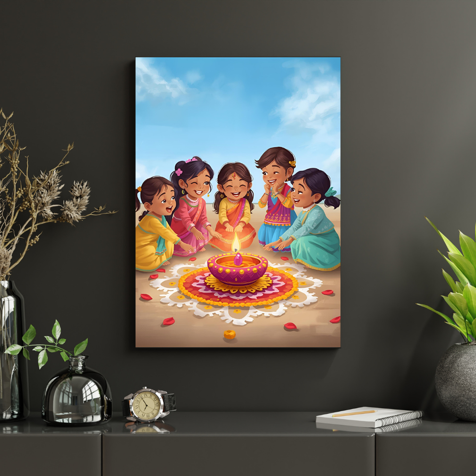 A heartwarming canvas of children gathered around a glowing diya and rangoli, celebrating the festival of lights with laughter and togetherness.