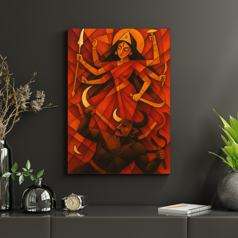 A bold, abstract canvas of Goddess Durga slaying Mahishasura, rendered in fiery red tones, symbolizing victory, strength, and divine justice.
