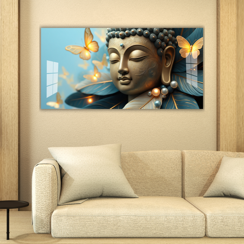 A serene fusion of butterflies, pearls, and teal feathers — this Buddha artwork radiates peace, purity, and spiritual upliftment. 🌼💛