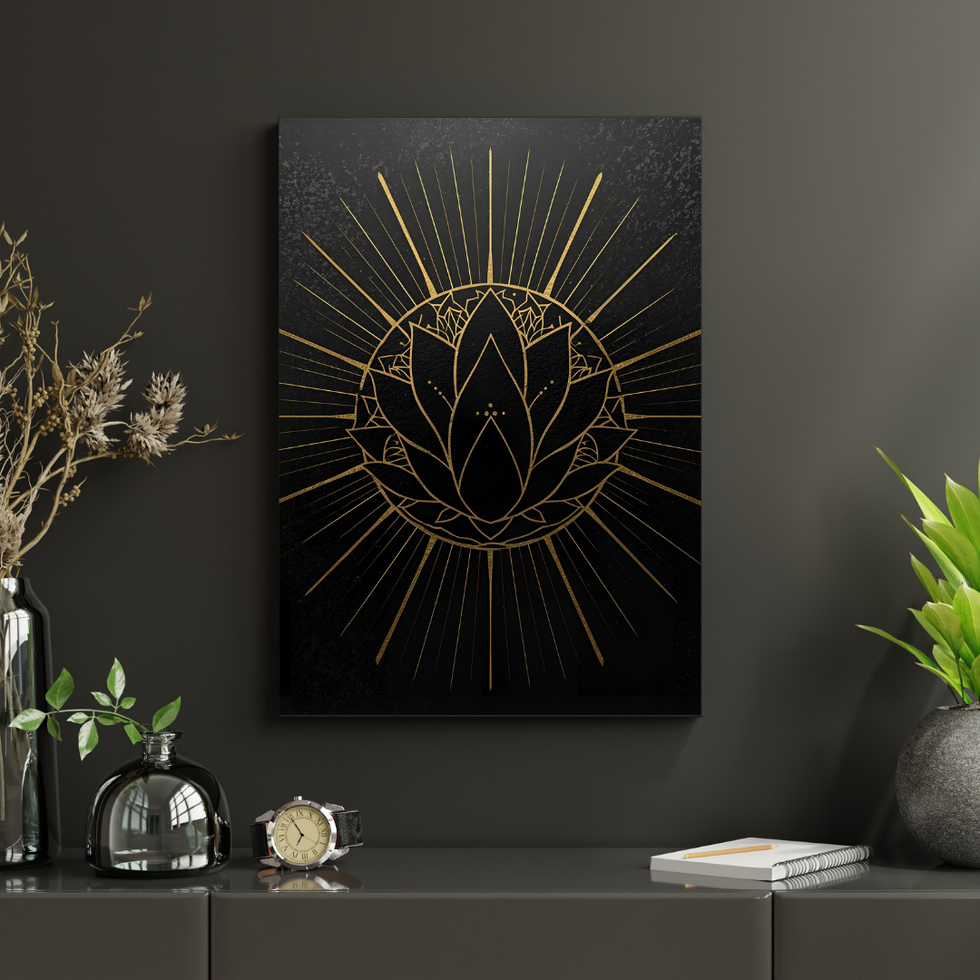 A striking canvas featuring a golden lotus design on a deep black background, symbolizing purity, strength.