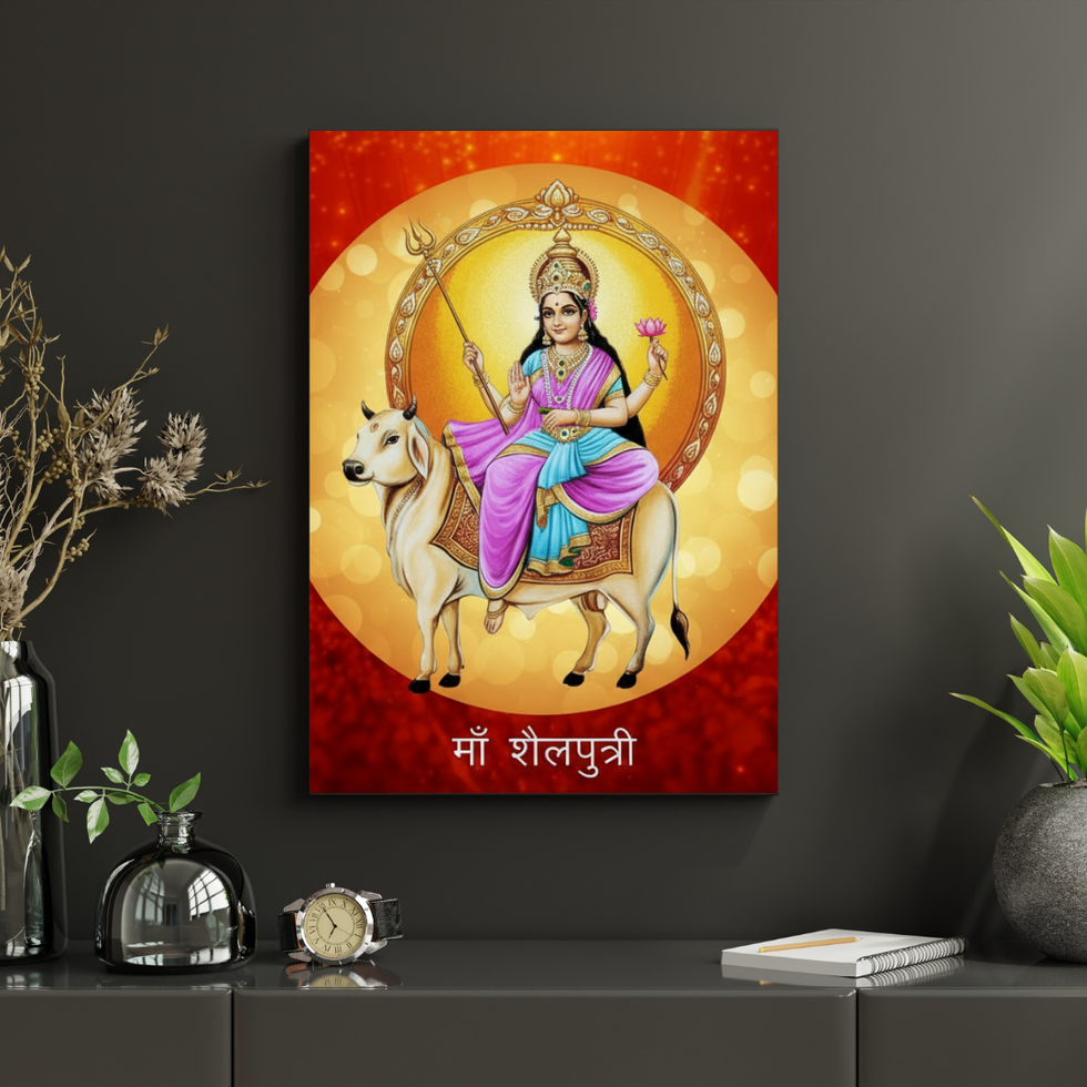 A divine canvas of Maa Shailputri seated gracefully on a bull, holding a trident and lotus, symbolizing purity, strength, and the essence of Navratri’s first day.