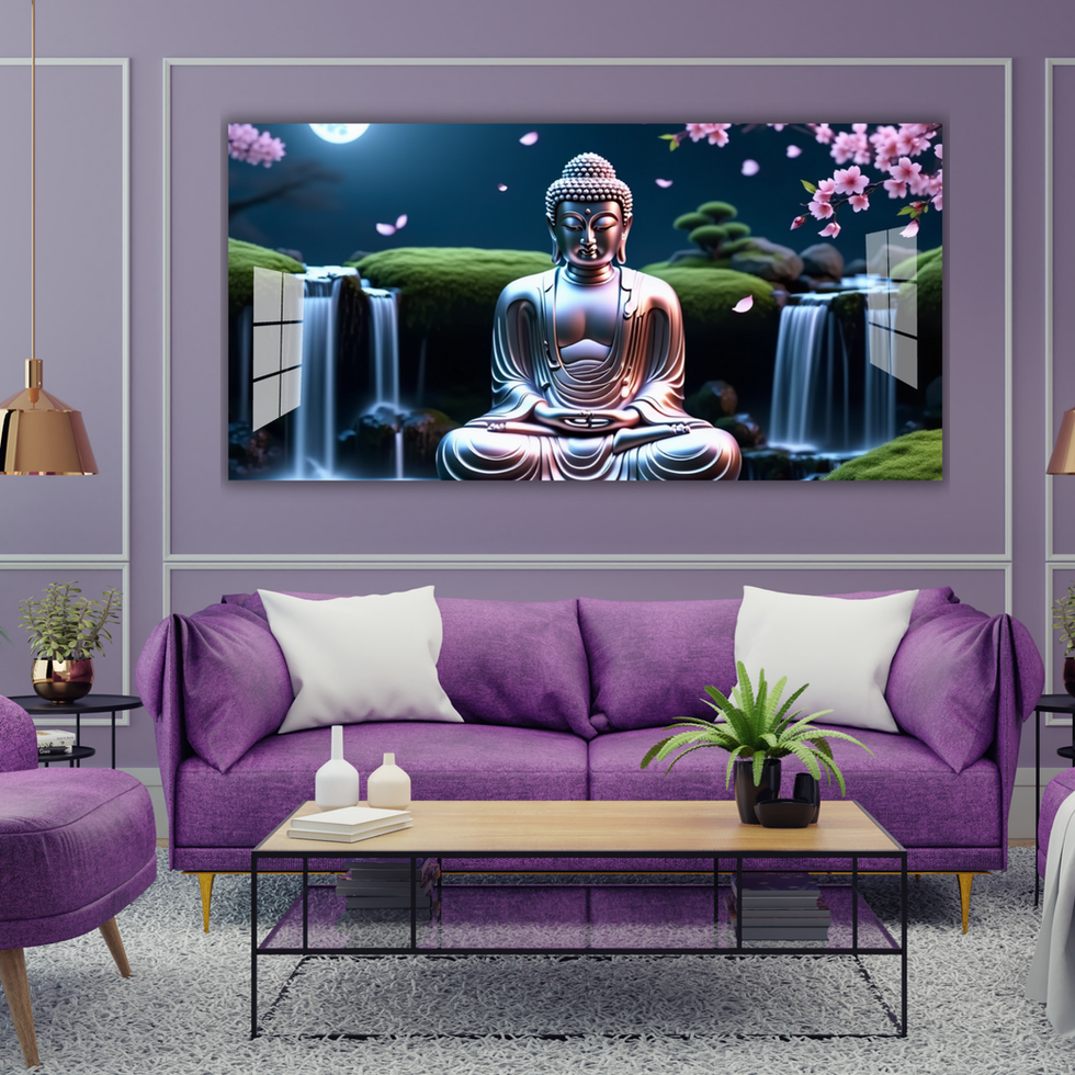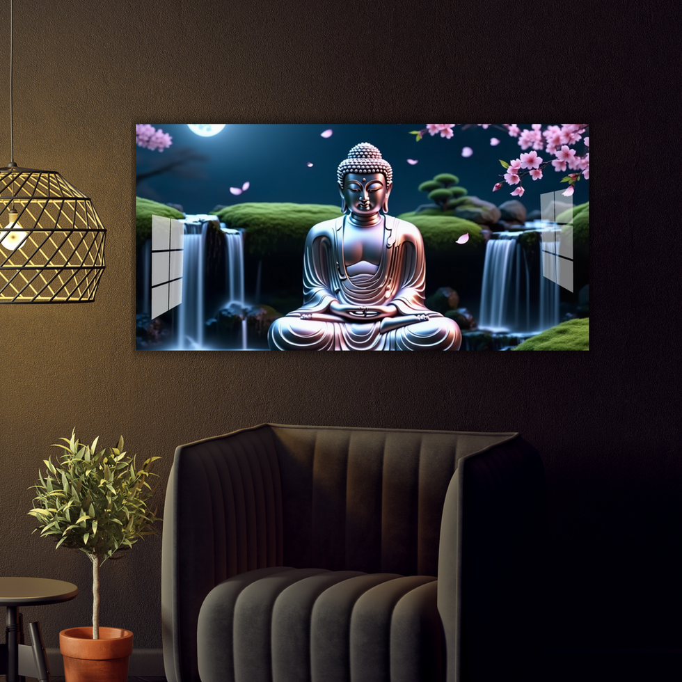🌙✨ A calming artwork of Buddha under the moonlight, surrounded by waterfalls and cherry blossoms — a perfect symbol of peace, purity, and harmony for your space.