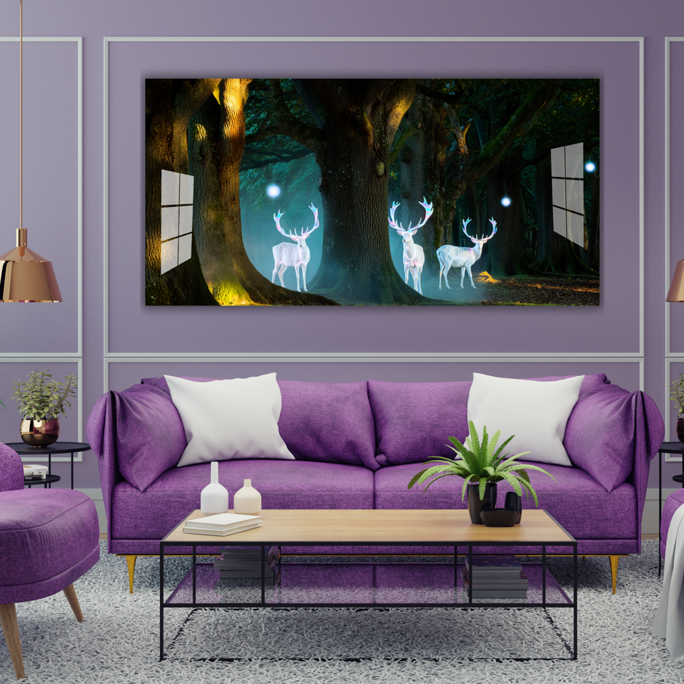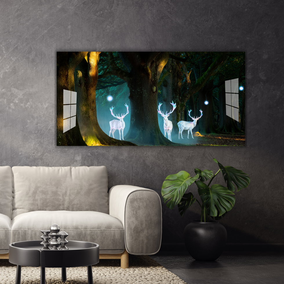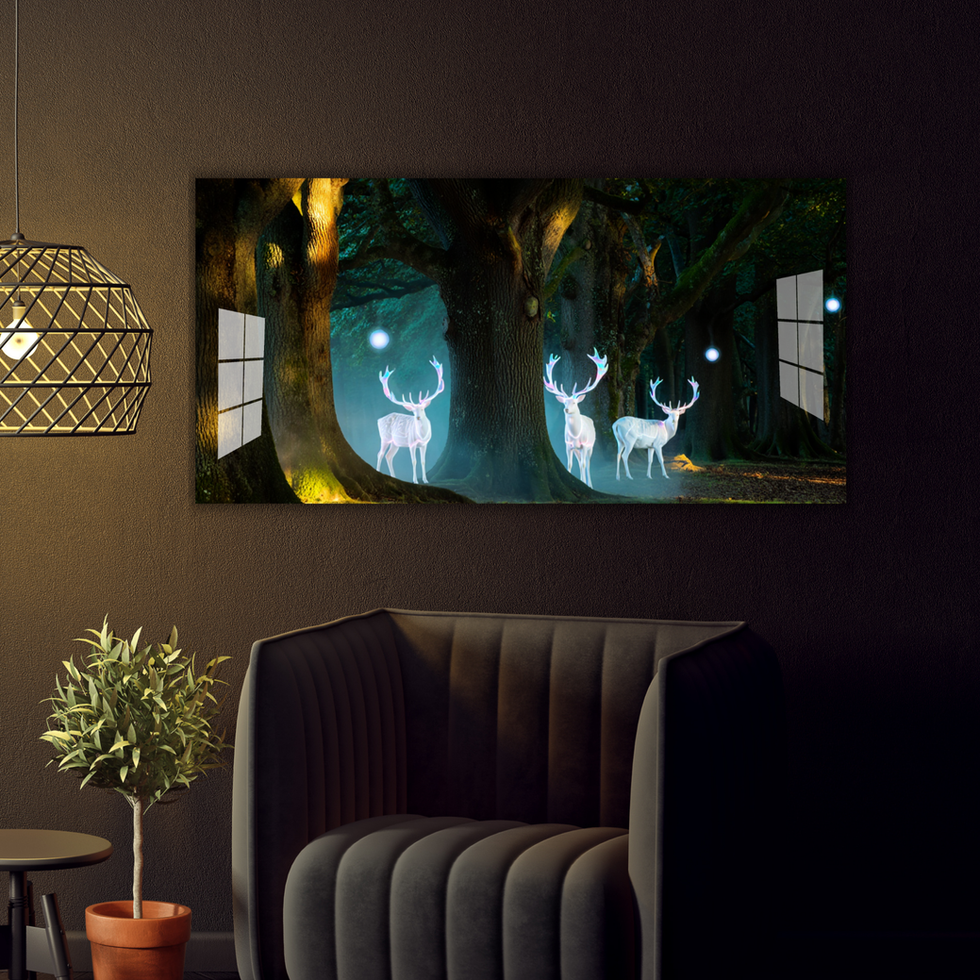 Step into a dreamlike forest where glowing celestial deer wander beneath ancient trees.