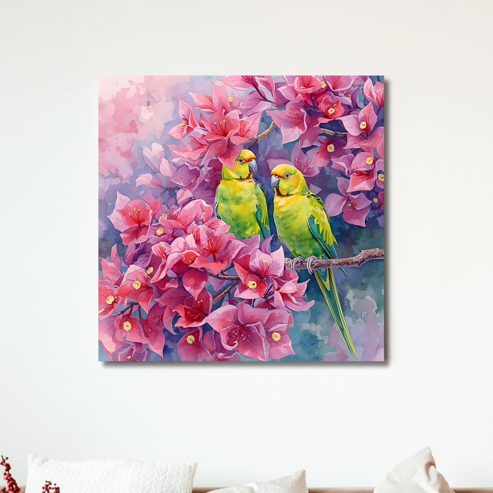 A lively canvas of two green parrots nestled among blooming pink flowers, capturing the joy and freshness of spring in nature.