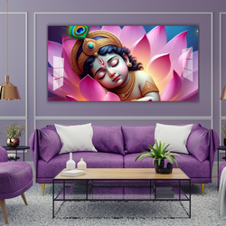 A serene acrylic frame of Baby Krishna resting on a lotus, symbolizing purity, love, and divine blessings — a perfect addition to your peaceful home corner.