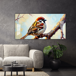 A charming little sparrow resting on a branch, painted with warm golden strokes and soft textures.