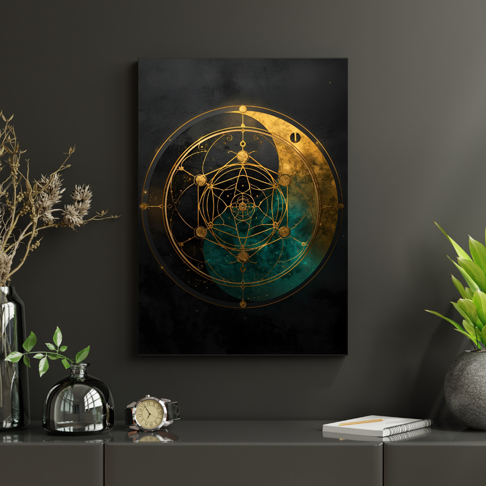 A golden cosmic Yin-Yang infused with sacred geometry, symbolizing balance, unity, and the eternal harmony of light and shadow.